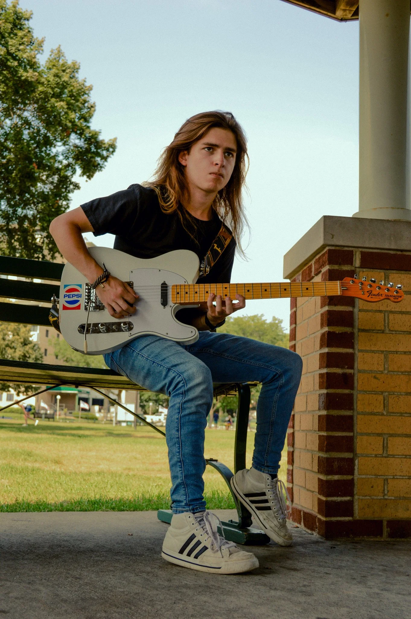 A young man with long hair sitting on a bench outdoors, playing an electric guitar. He is wearing a black t-shirt, blue jeans, and white high-top sneakers, with a sticker on the guitar. The background shows trees and a park.